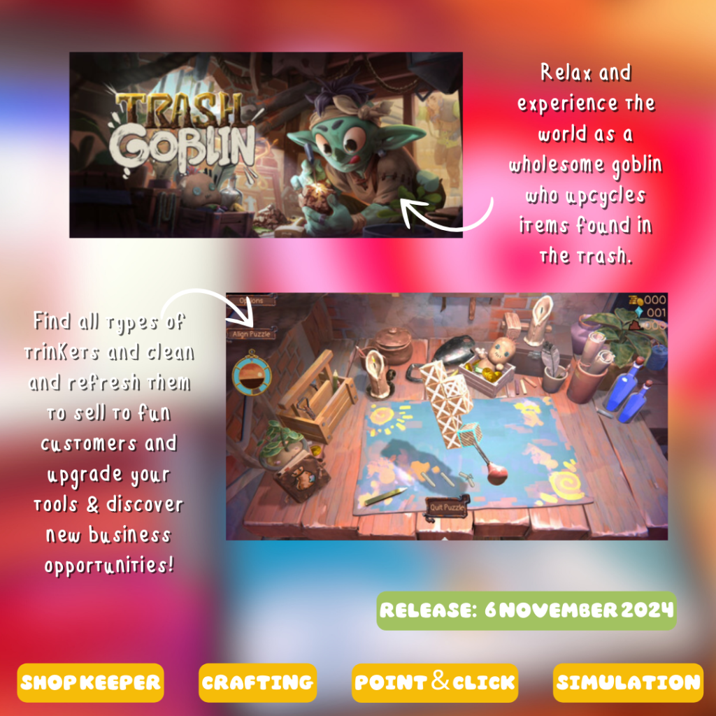 Relax and experience the world as a wholesome goblin who upcycles items found in the trash.