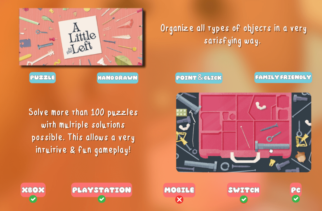 Keywords: Puzzles, logic, colorful, indie, relaxing, hidden object, point & click