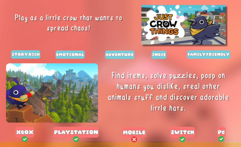 Find items, solve puzzles, poop on humans you dislike, steal other animals stuff and discover adorable little hats.