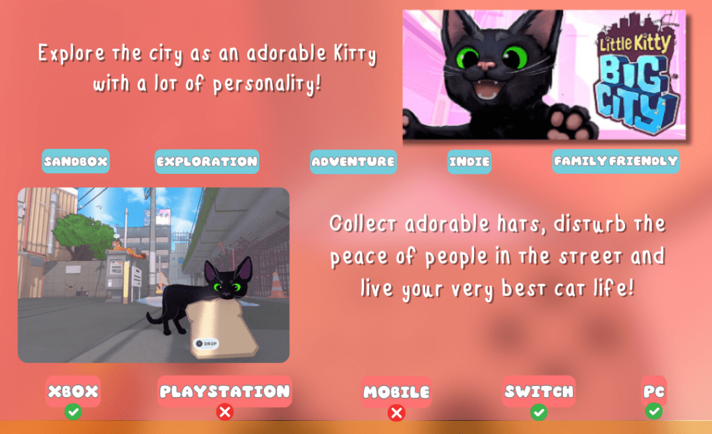 Keywords: Cats, exploration, funny, indie, colorful, adventure, wholesome, sandbox, family friendly
