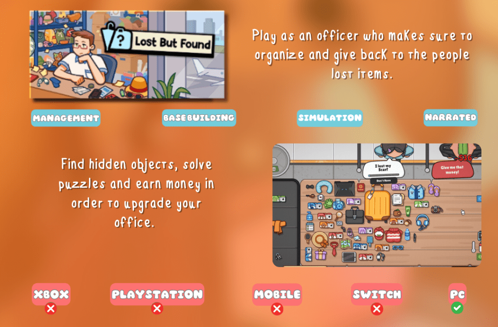 Play as an officer who makes sure to organize and give back to the people lost items.