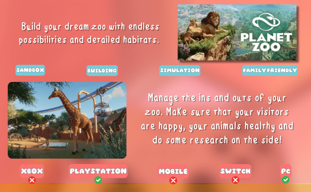 Manage the ins and outs of your zoo. Make sure that your visitors are happy, your animals healthy and do some research on the side!