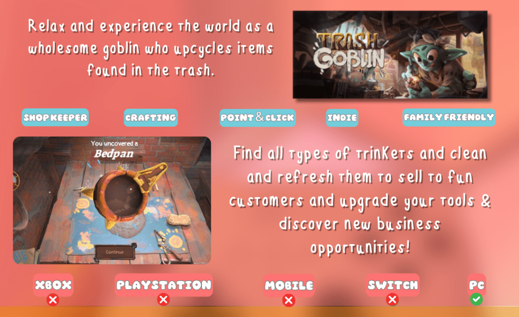 Relax and experience the world as a wholesome goblin who recycles items found in the trash.