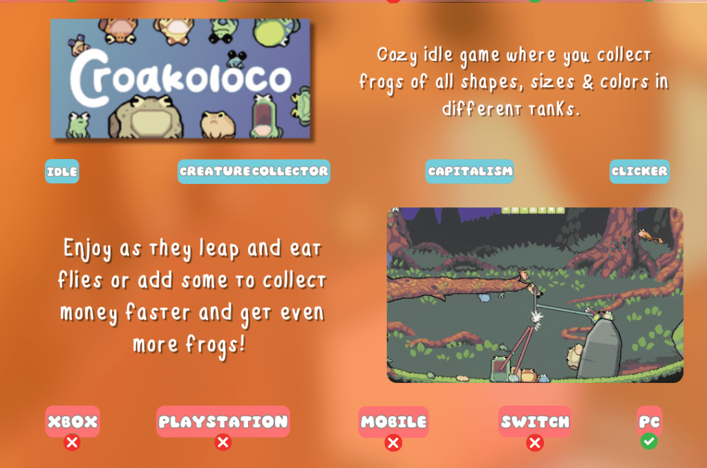 Cozy idle game where you collect frogs of all shapes, sizes & colors in different tanks.