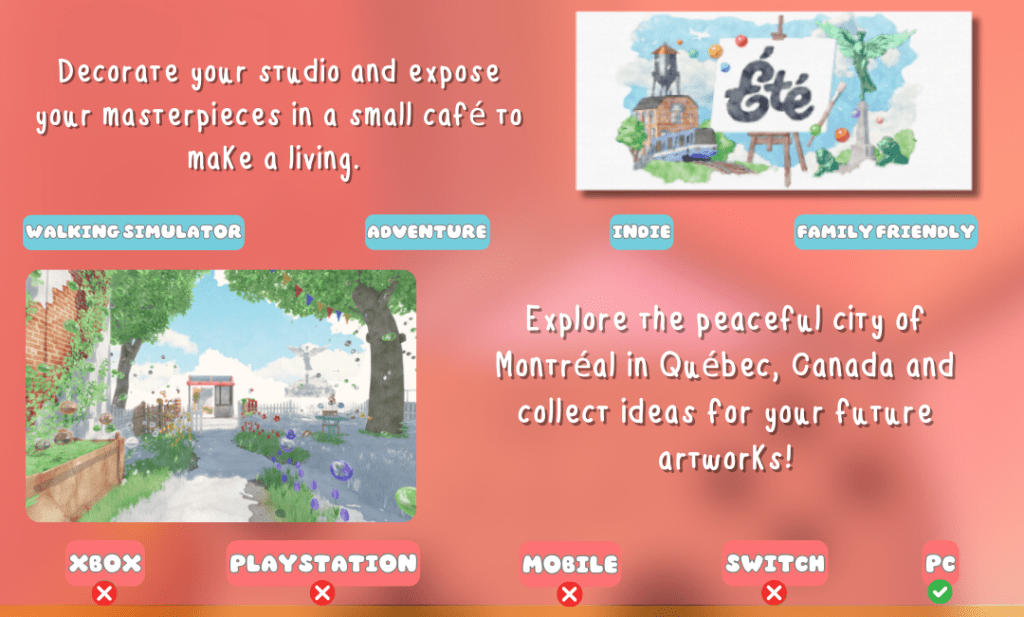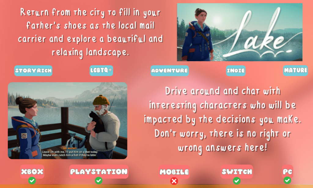 Keywords: Relaxing, walking simulator, female protagonist, cozy, choose your own adventure, LGBTQ+, atmospheric