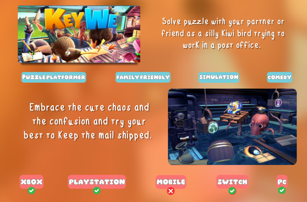 Keywords: Cute, co-op campaign, family friendly, 3D, puzzle, platformer, puzzle platformer, silly