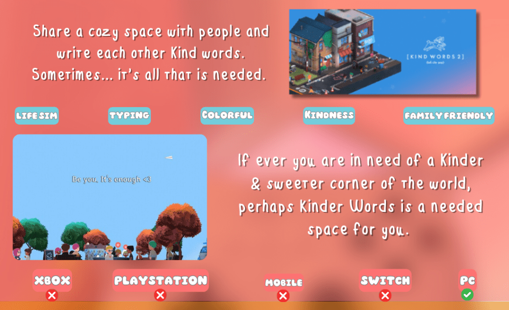 Keywords: Casual, massively multiplayer, emotional, typing, cute, life sim, sandbox, family friendly, inclusive
