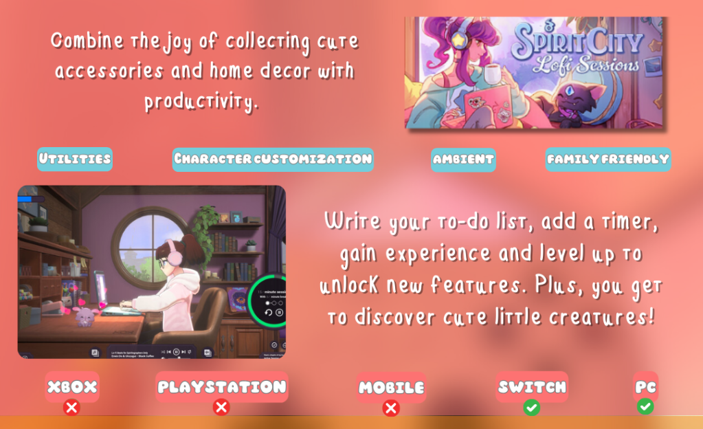 Keywords: Cozy, life sim, utilities, productivity, character customization, family friendly, immersive, wholesome