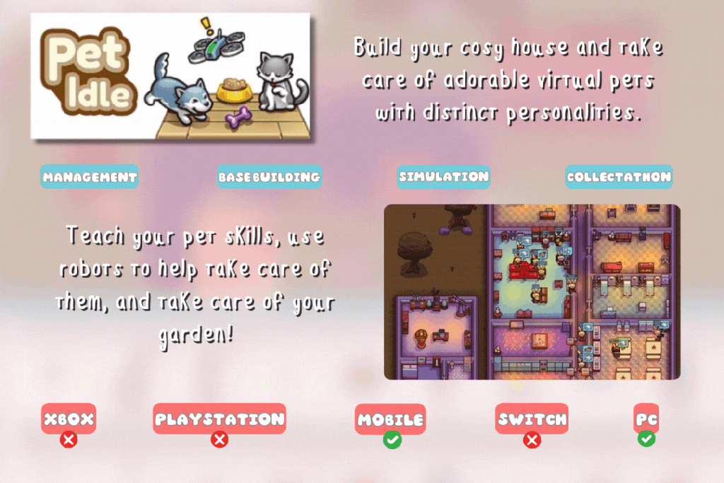 Build your cozy house and take care of adorable virtual pets with distinct personalities.