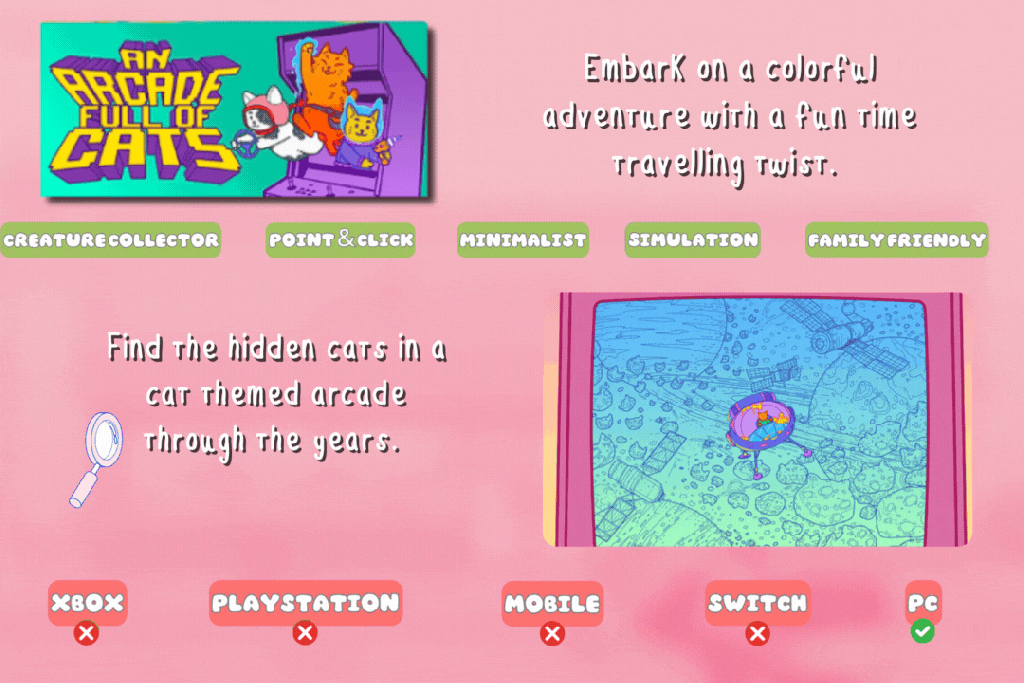 Keywords: Cats, hidden object, relaxing, puzzle, wholesome, point & click, arcade, adventure, creature collector, family friendly