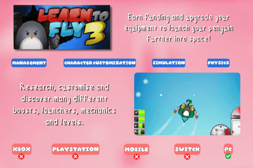 Earn funding and upgrade your equipment to launch your penguin further into space!