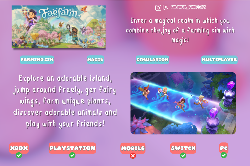 Key words: RPG, farming sim, cozy, co-op, colorful, magic, LGBTQ+, crafting, cooking, romance, action, family friendly