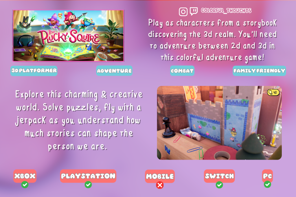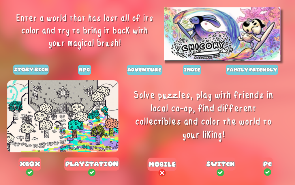 Keywords: Indie, cute, puzzle, hand-drawn, open world, family friendly, female protagonist, colorful, 2D