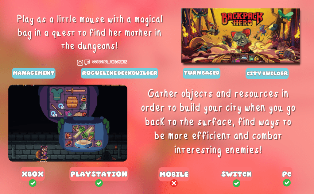 Key words: Roguelike deckbuilder, card battler, indie, roguelike, strategy, card game, RPG. replay value, colorful, cute