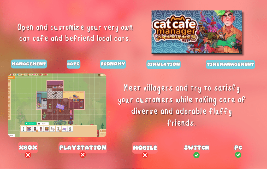 Keywords: Simulation, management, strategy, cats, cozy, wholesome, cartoony, colorful, capitalism, drama, time management, trading