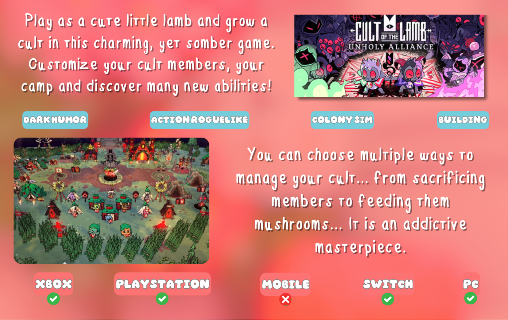 Play as a cute little lamb and grow a cult in this charming, yet somber game. Customize your cult members, your camp and discover many new abilities!