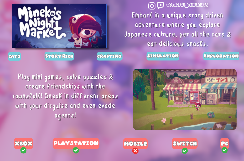 Embark in a unique story driven adventure where you explore Japanese culture, pet all the cats & eat delicious snacks.