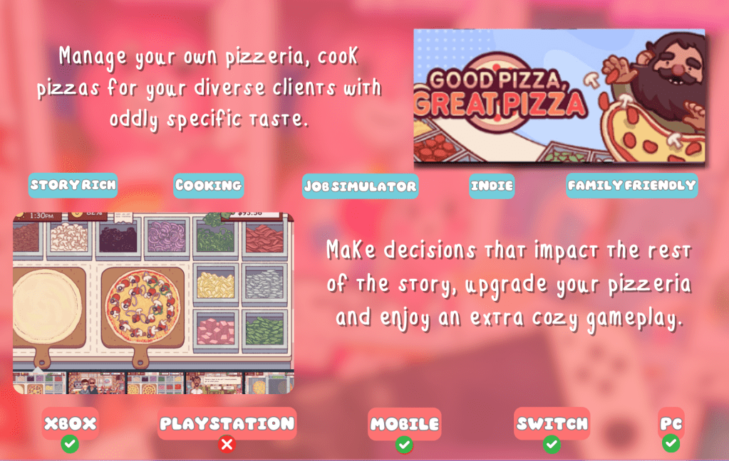 Key words: Cooking, simulation, casual, story rich, job simulator, resource management, indie, family friendly