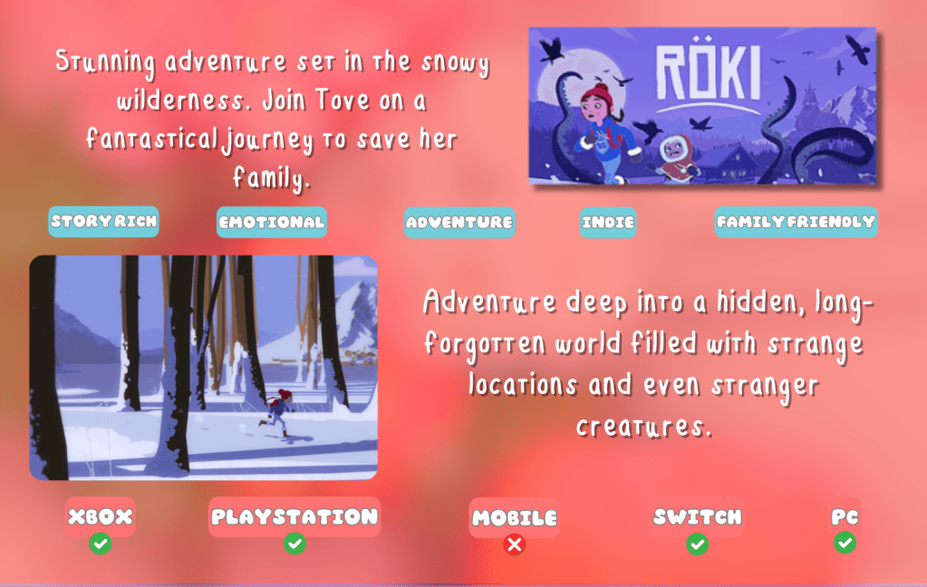 Keywords: Story rich, emotional, adventure, indie, family friendly