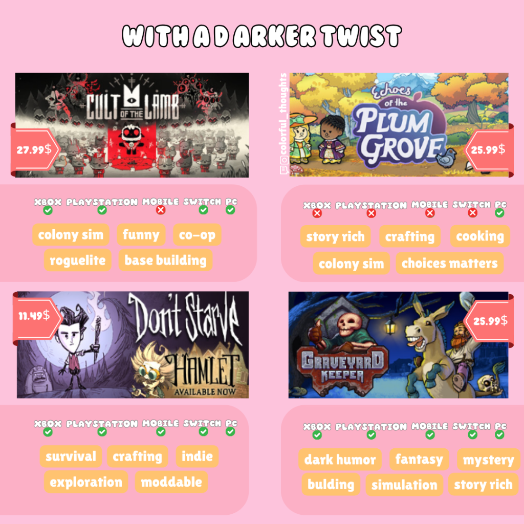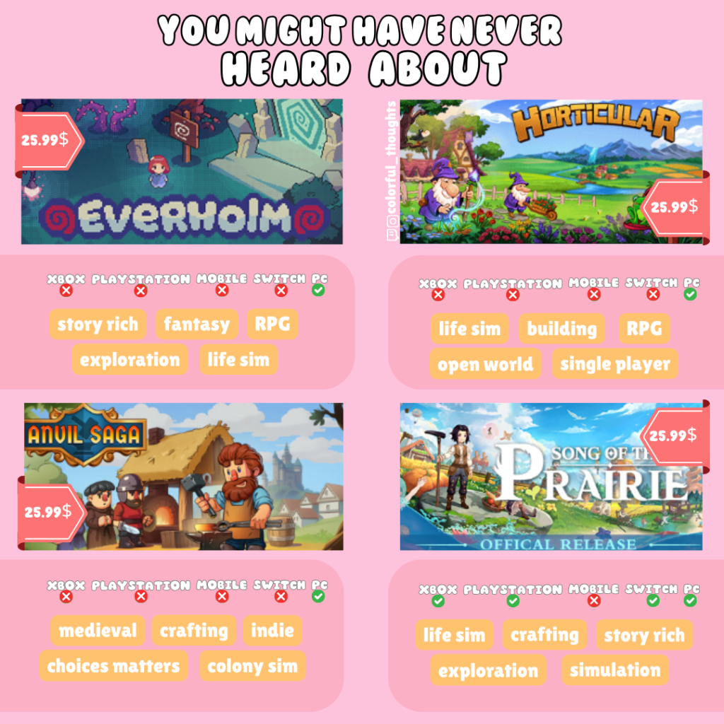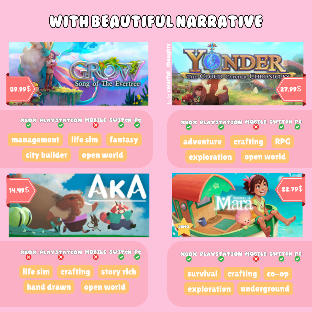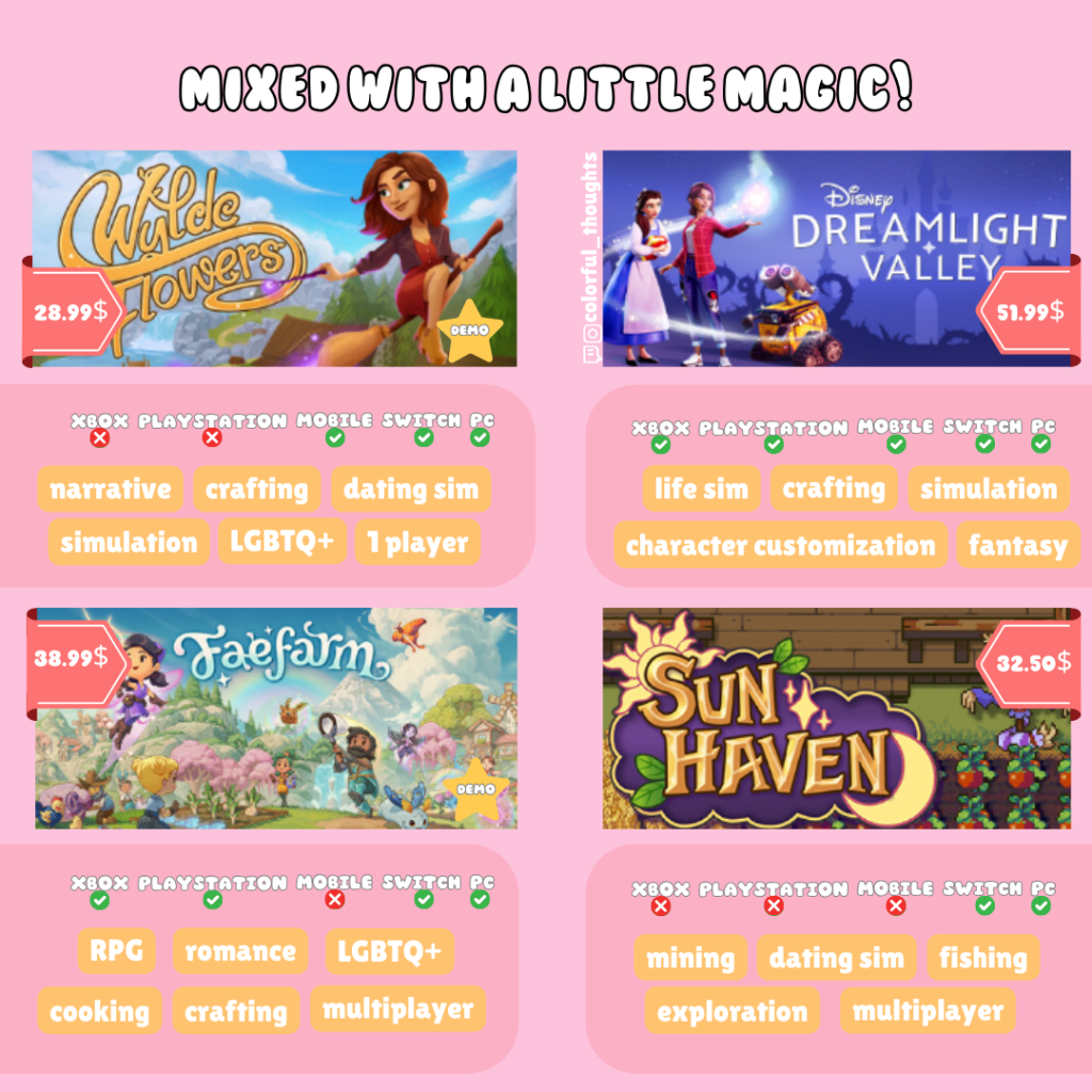The story is rich and fully voice acted with diverse characters you can romance. Farm, craft, brew potion and join a coven!
