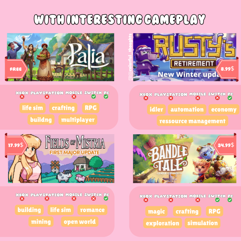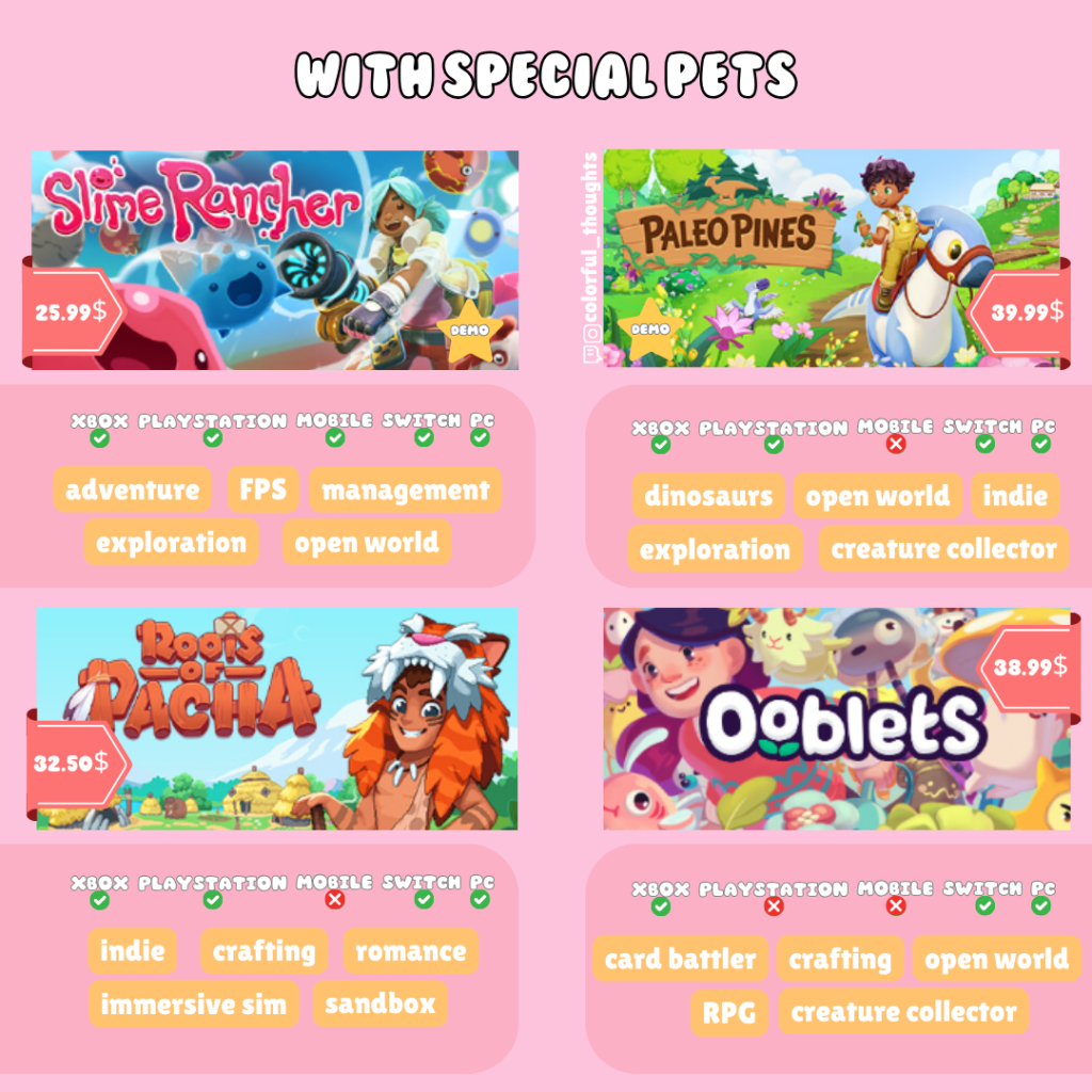 Cozy and coloful farming game with adorable little creature called ooblets. Dance battles, grow and manage different ooblets and explore a beautiful world!